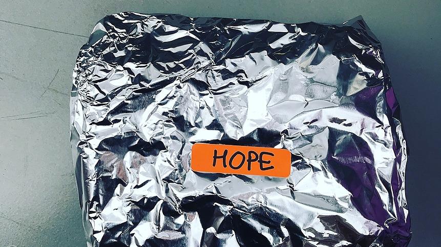 I have no spare change because I dare not trust myself on the streets. I need to go out with purpose, prepared. So I have a plan. I buy eggs, bread, butter, oil. Saturday morning I get up early, put the oil in the paella pan, write stickers with ‘Hope’ on, cut up squares of foil. Go to the pan to crack the egg. Suddenly, it erupts in fourteen inch yellow flames. I freeze. The flames grow. My impulse, my fear is to throw on water, the tea towel. No smoke alarm goes off because the landlord omitted to fit them. I’ve barely been here three weeks and I am about to set a tower block on fire. I see in slow motion my hand, my arm in flames, the same flames of my conscience, the countertop, the fridge, the sofa, yellow and red flames. And then a still sure voice: Let it burn. Don’t feed the flame. It’ll die if you don’t feed it.
