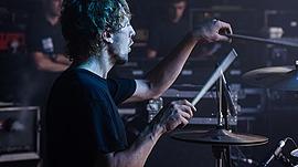 Adam Clarke sitting on his grandad's crate (preferred stool) playing drums.